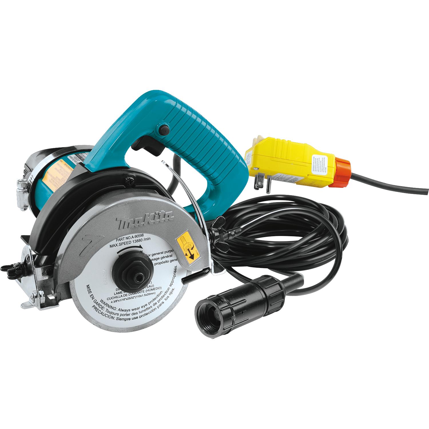 The Makita 4101RH 5-in wet-cutting masonry saw features a powerful 7.9 AMP motor and is ideal for wet cutting of tile, masonry, concrete, and more. The 4101RH will cut up to 1-5/8" at 90 degrees and 1" at 45 degrees. Additional features include a ground fault circuit interrupter (GFCI) plug, and a special cover design engineered to prevent water from entering the motor housing. The lock-on button allows for easy continuous operation. Also includes 15 ft. of tubing, as well as a water pressure regulator and water valve.