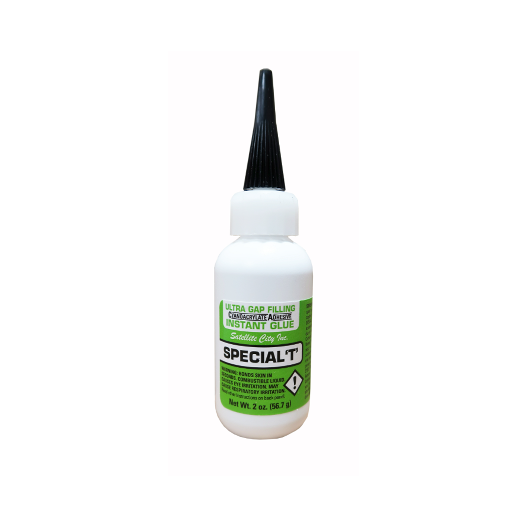 Special T THICK gap-filling CA glue (green label) has a viscosity (1150-1500) similar to honey. This super glue works great when you use it to bond both porous and non-porous parts, and it can fill larger gaps than our Super T medium CA glue. It is best used to glue parts that are missing pieces or don’t fit very well together. You can bond the same materials as with our other CA glue- wood, metal rubber, nitrile, composites, many types of plastics- and Special T is effective even when a poor fit makes parts look impossible to bond. The gap-filling capability is very useful when there is a large chunk missing from a surface- filling that space with Special T can preserve the structural integrity, seal the area from moisture and contaminants, bond something to the exterior that would not fit otherwise, cover and protect jagged edges, and improve the look of the surface.