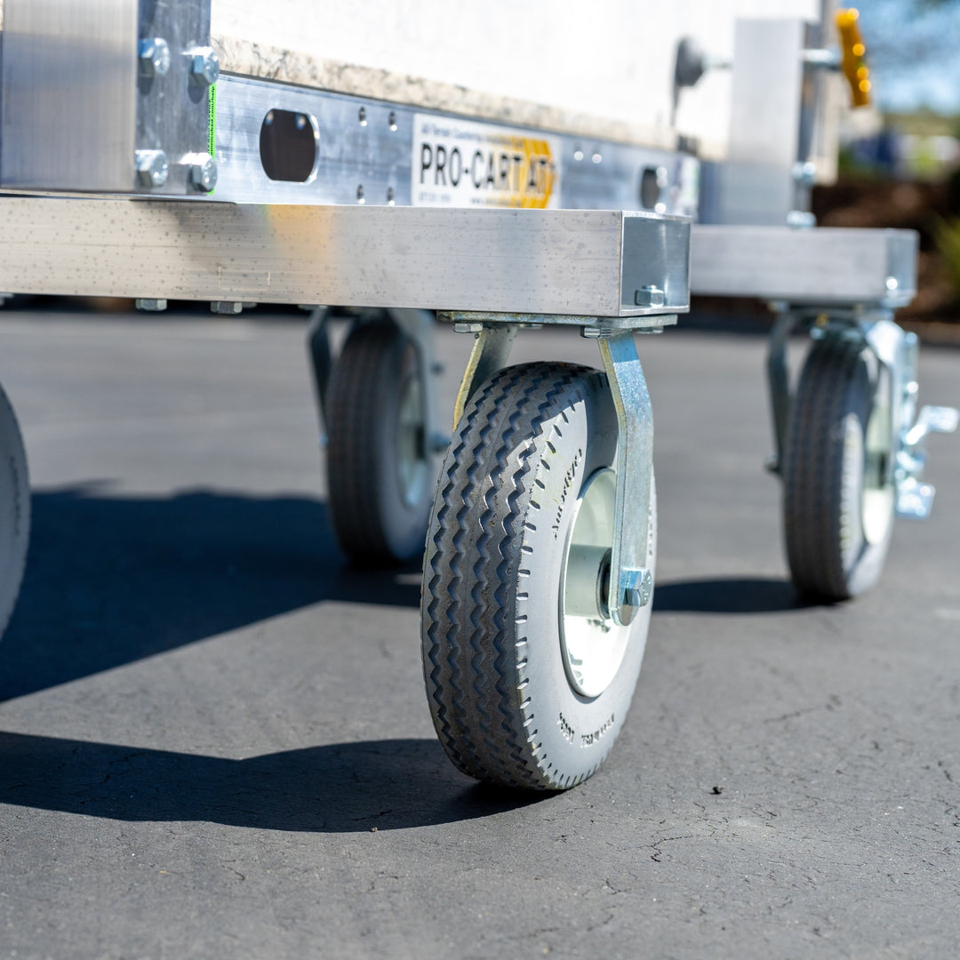 All-terrain tires 8" flat-free, non-marking, closed-cell tires easily roll over gravel and lawns. Unlike other flat-free tires that are imported, our American made closed-cell tires perform like pneumatic tires (absorbing bumps) so the material doesn’t. And because they are “true” closed-cell, they will not absorb water or moisture like cheap imported tires.