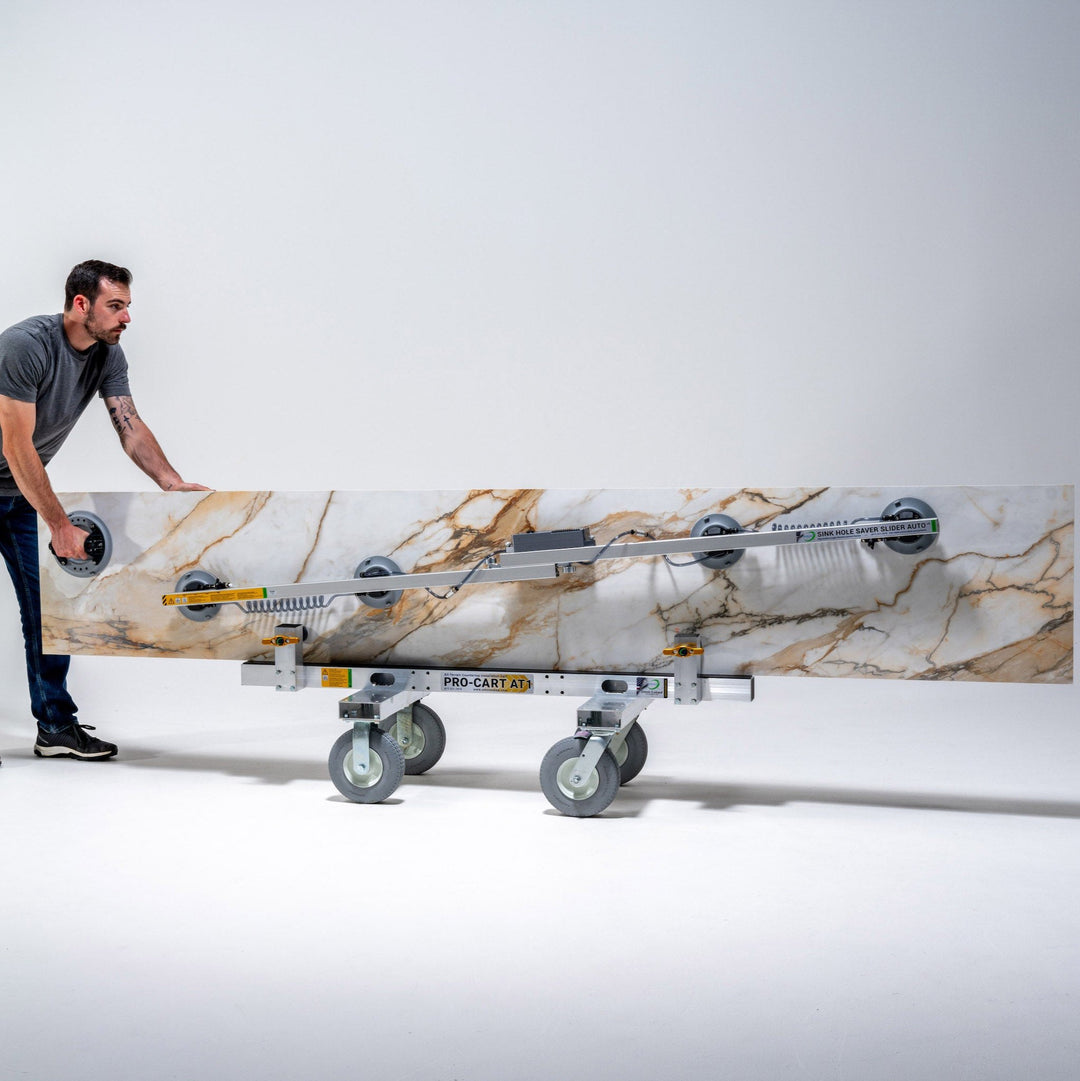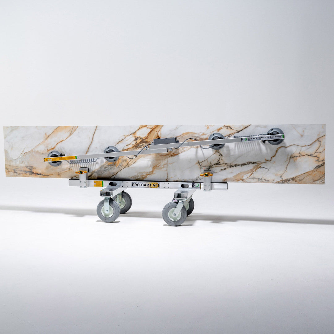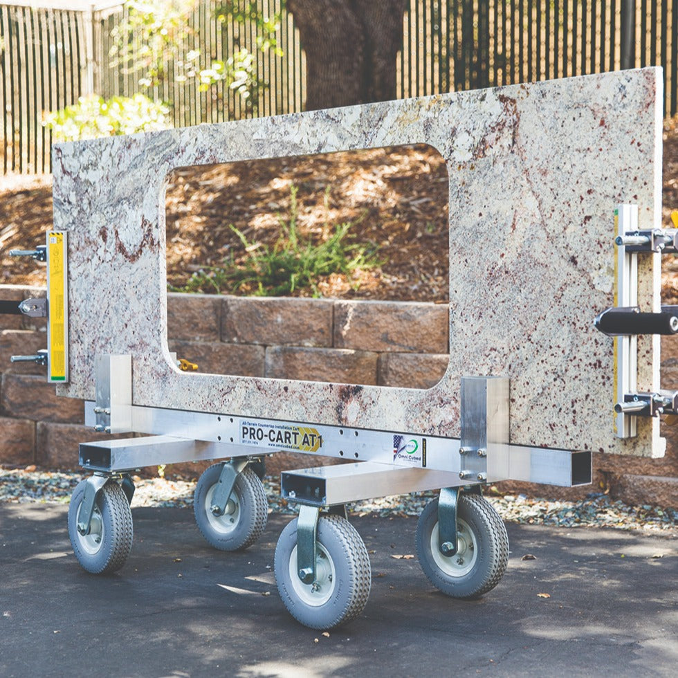 Conquer tough terrain effortlessly with the Pro-Cart AT1, a lightweight and durable solution for stone and glass transportation, featuring integrated clamps, high ground clearance, and reliable non-marking tires, reducing worker strain and making challenging installations more manageable.