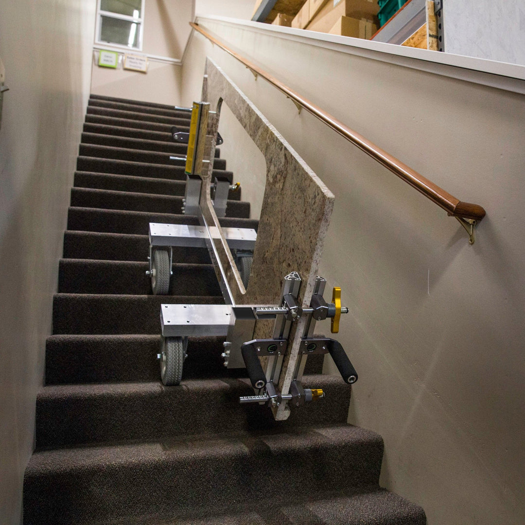 Integrated clamps and high ground clearance allow popping wheelies or climbing stairs with stone or glass attached, taking the dread out of those challenging installation sites. Strong aluminum tubing makes this cart lightweight and highly durable. The Pro-Cart AT1 is extremely stable, easily maneuverable, and can be operated by a single person in many cases. The AT1 can accommodate a 750 lb load, yet weighs less than 50 pounds.