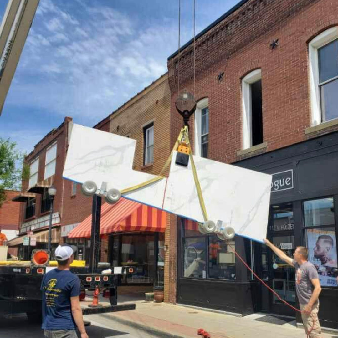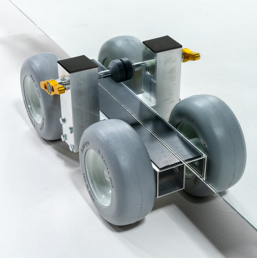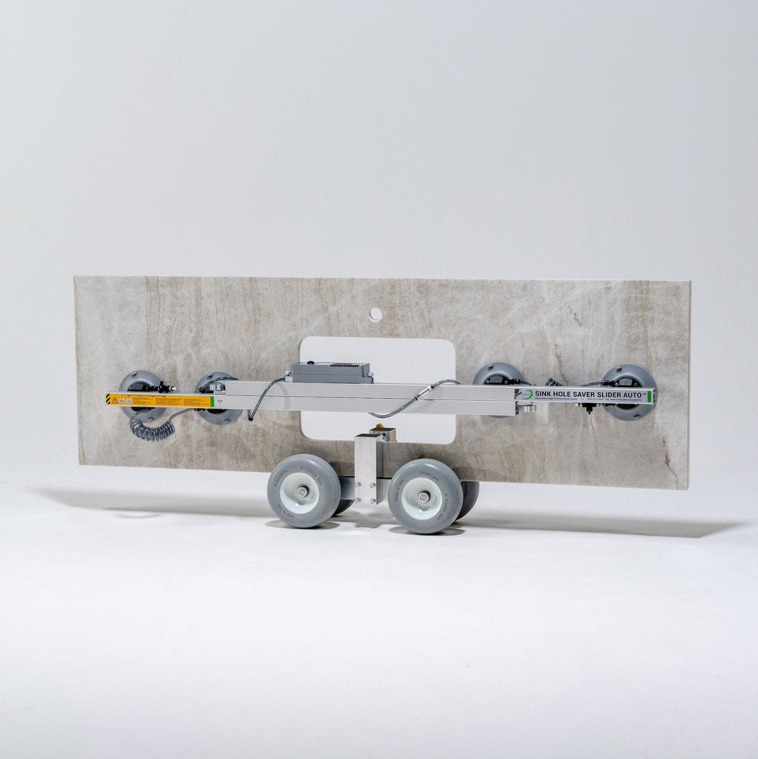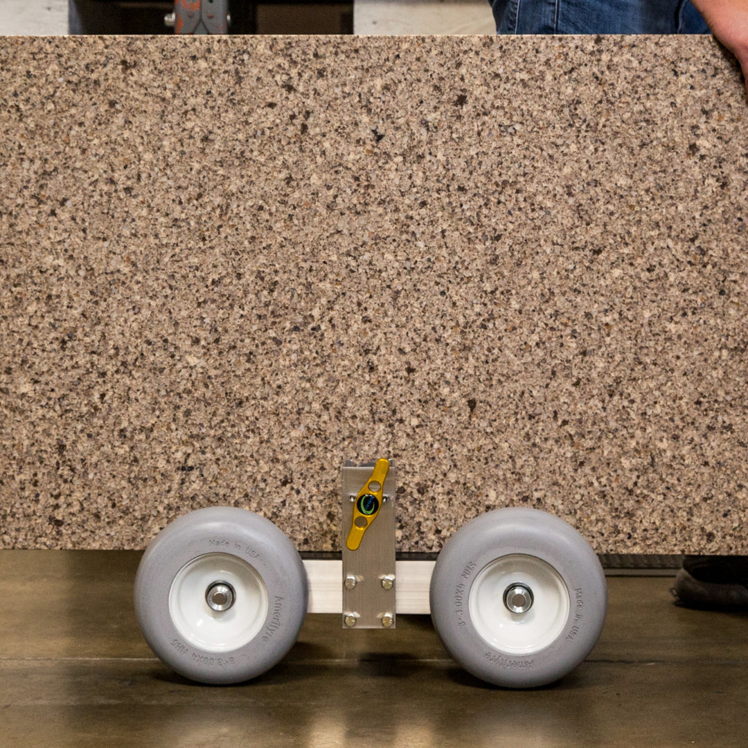 The dolly cart's low profile allows more clearance for tall pieces through doorways. This product is often used in pairs to handle extra large pieces of stone, or glass (up to 1,500 lb). Integrated clamps hold countertops securely on the dolly, so the dolly can stay attached from fabrication shop to final placement. The HD1 features 8" non-marking, flat-free tires with excellent shock absorption, and a rubber-lined support rail to prevent damage to the material.