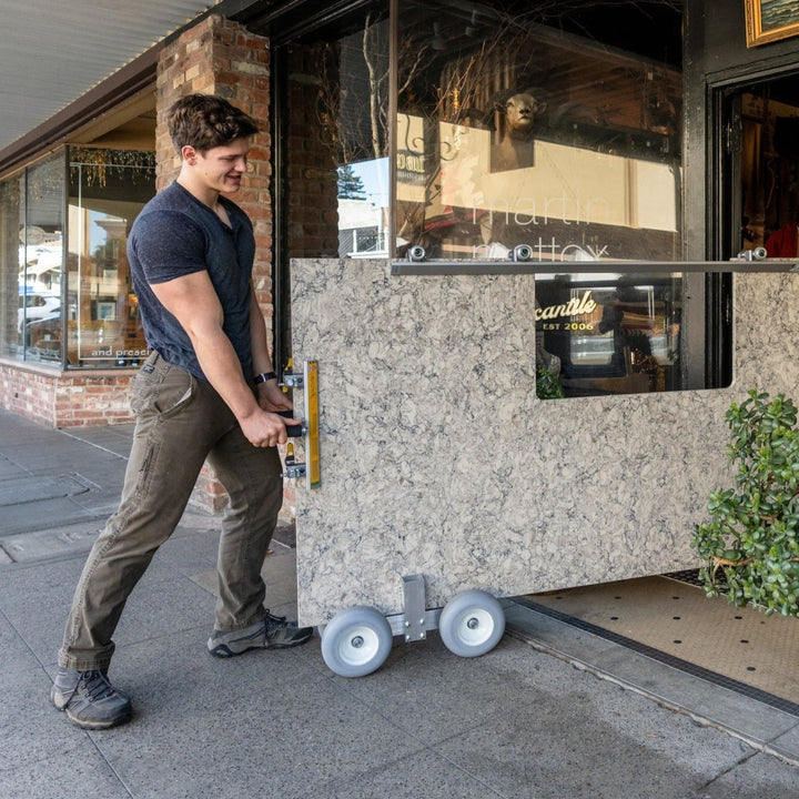 Simplify countertop transport and installation with the Pro-Dolly™ HD1, a lightweight, low-profile, aluminum dolly weighing just 21 pounds yet capable of handling up to 750 lbs, offering a low profile for easy clearance through doorways, integrated clamps for secure countertop attachment, and compatibility with the Aqua-Jaw™ Carry Vise™ for ultimate convenience.