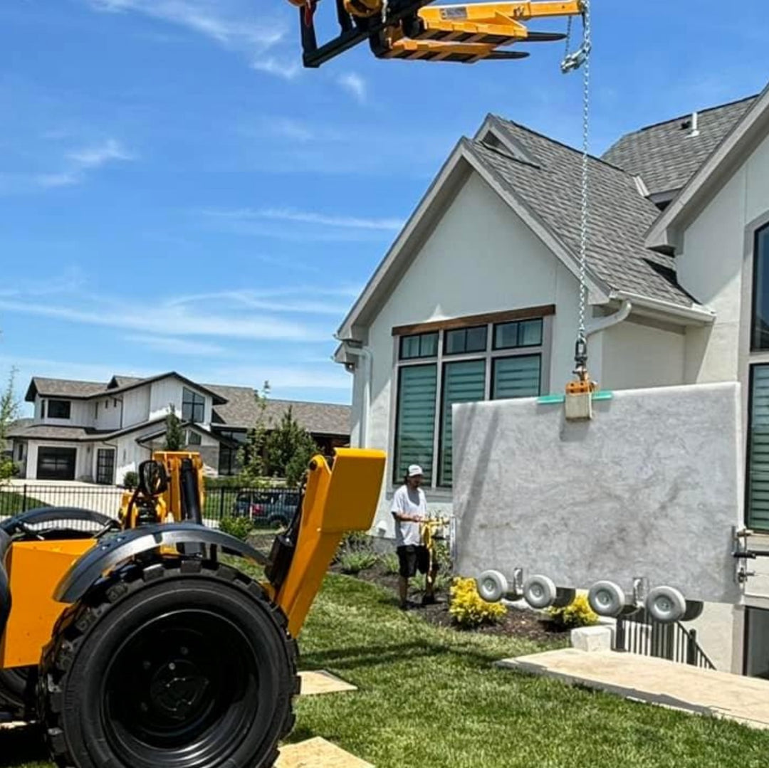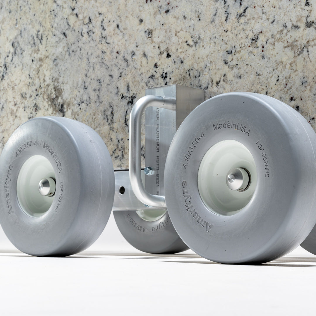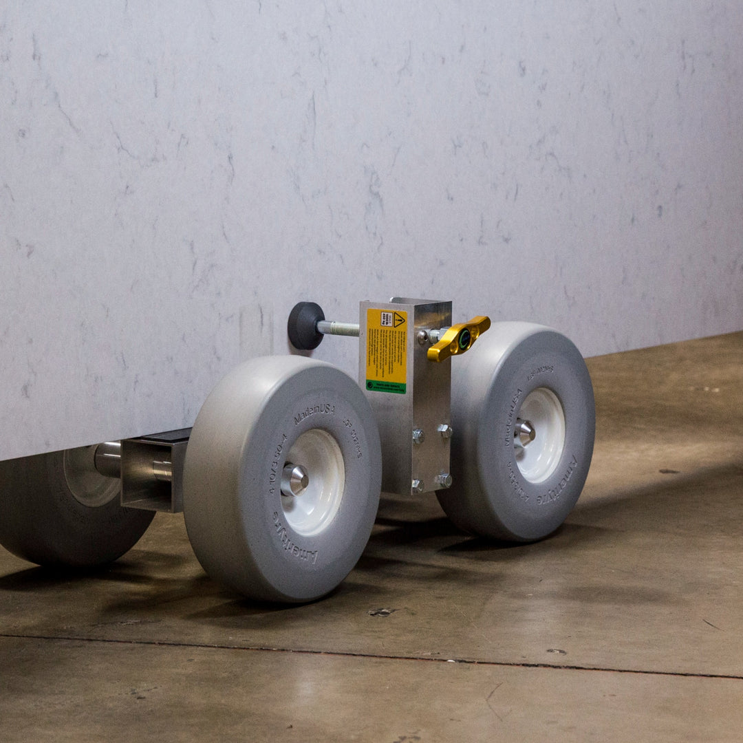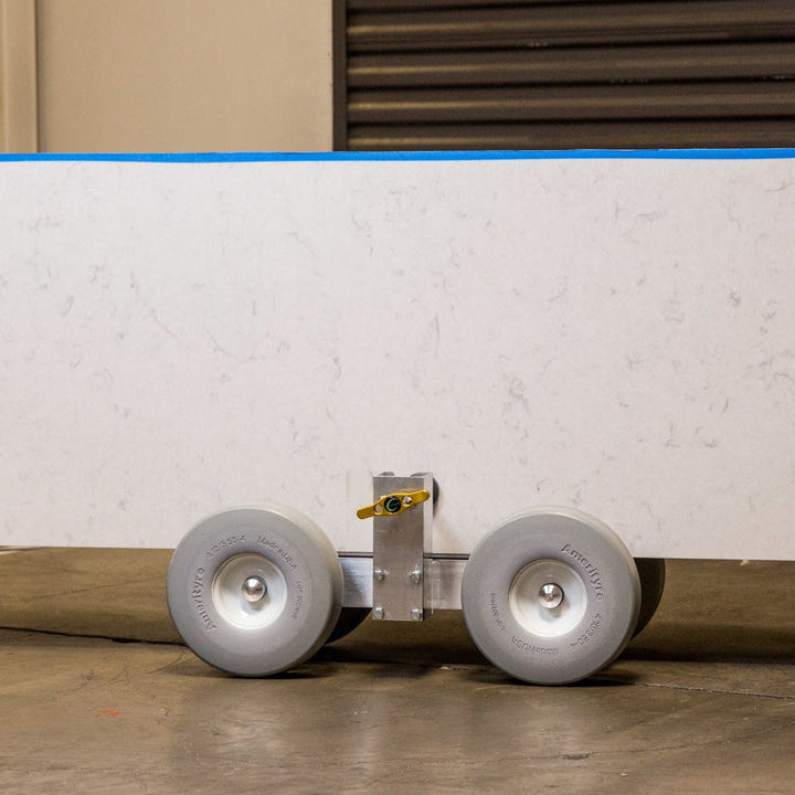 This product is often used in pairs to handle extra large pieces of stone and glass (up to 2,000 lb). Integrated clamps hold countertops securely on the dolly, so the dolly can stay attached from fabrication shop to final placement. The HD2 features 10" non-marking, flat-free tires with excellent shock absorption, and a rubber-lined support rail to prevent damage to stone.