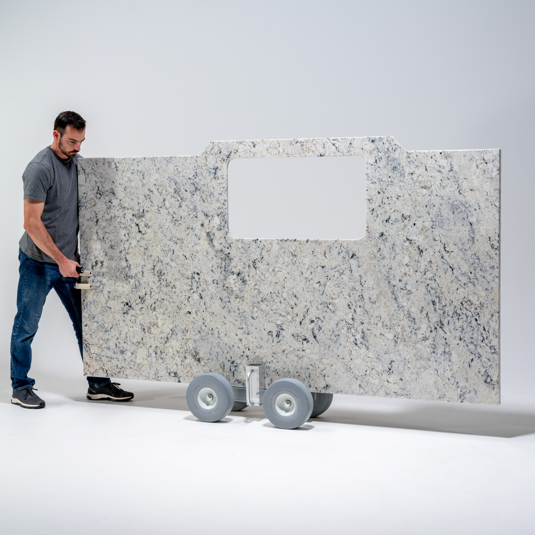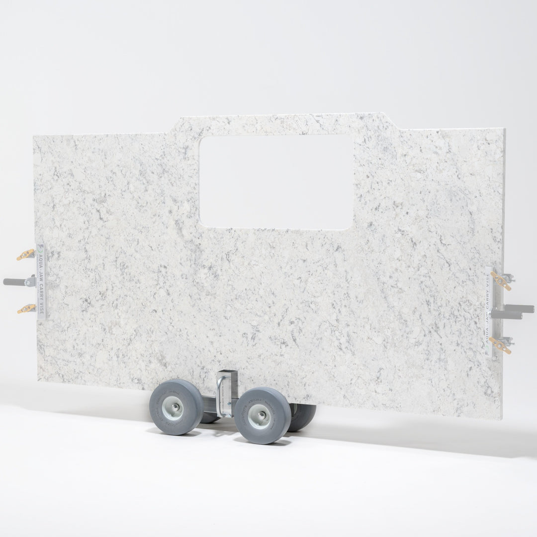 Simplify the transport and installation of glass panels and stone countertops with the Pro-Dolly™ HD2. Weighing only 35 pounds, this aluminum-framed dolly cart can handle up to a half-ton load, and its low profile ensures easy clearance through doorways. Integrated clamps securely hold countertops, and an oversized clamp opening accommodates thicker edge details up to 5” (12.7 cm).
